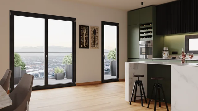 La finestra VISION 2020 di FINESTRENURITH combina la robustezza dell’alluminio con la leggerezza del PVC, offrendo aperture generose e una percezione di spazio ampliata. Il nodo centrale ottimizzato favorisce una continuità visiva unica, permettendo di godere della luce naturale senza interruzioni.
